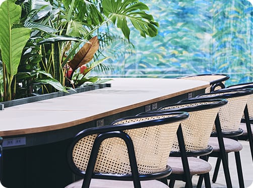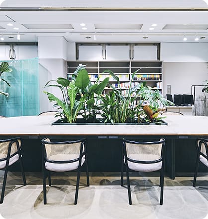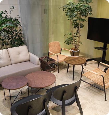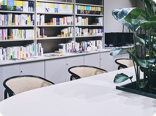 1Fフロアは、植物を囲むように設置された大きなテーブルや、ゆったりと座っていただける椅子、お打合せや談笑にもピッタリのソファ席があります。のんびりと過ごしたり、ゲストを招いてお打合せをしたりと、コミュニケーションを取りながら過ごしていただけます。Libraryもあり、会員の方へ貸し出しも可能です。たくさんの書籍の中から何かヒントが見つかるかもしれません。