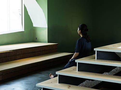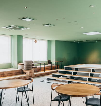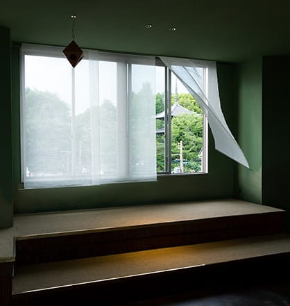 4Fフロアは、天窓や大きく開かれた窓から、自然の光や風を感じ、お寺の鐘の音を聞きながら過ごすことができる空間(TEN)です。靴をぬいでリラックスしながら、アイデアの創造や企画の構想などにお使いいただくことができます。