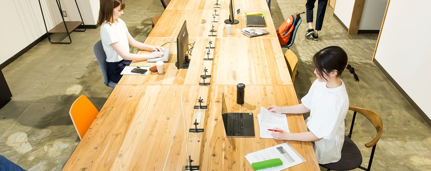活動を自由で快適に - ゆとりのあるフリーデスク、集中作業用の半個室やテレワークブース等、多様なはたらき方に対応しています。電源、Wi-Fi、複合機、貸出モニター等もご利用いただけます。