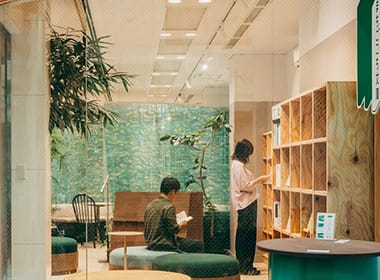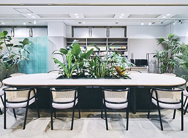 緑あふれる空間の中で、ソトとのつながりを感じながら過ごすワークプレイスです。お打合せや、会話を楽しんだり情報交換をしたりとコミュニケーションを取りながら仕事ができます。
