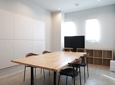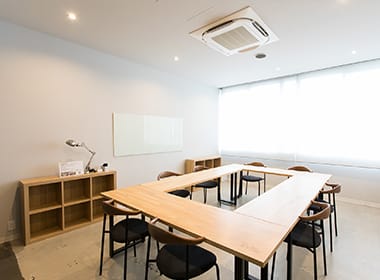 定員8名まで。少人数での打ち合わせやオンライン会議等にご活用いただけます。長テーブルは自由に配置変更が可能です。