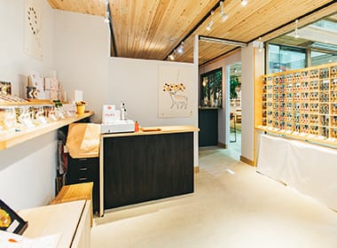木のグリッド調のファサードと大きな吹き抜けが印象的なBONCHI。