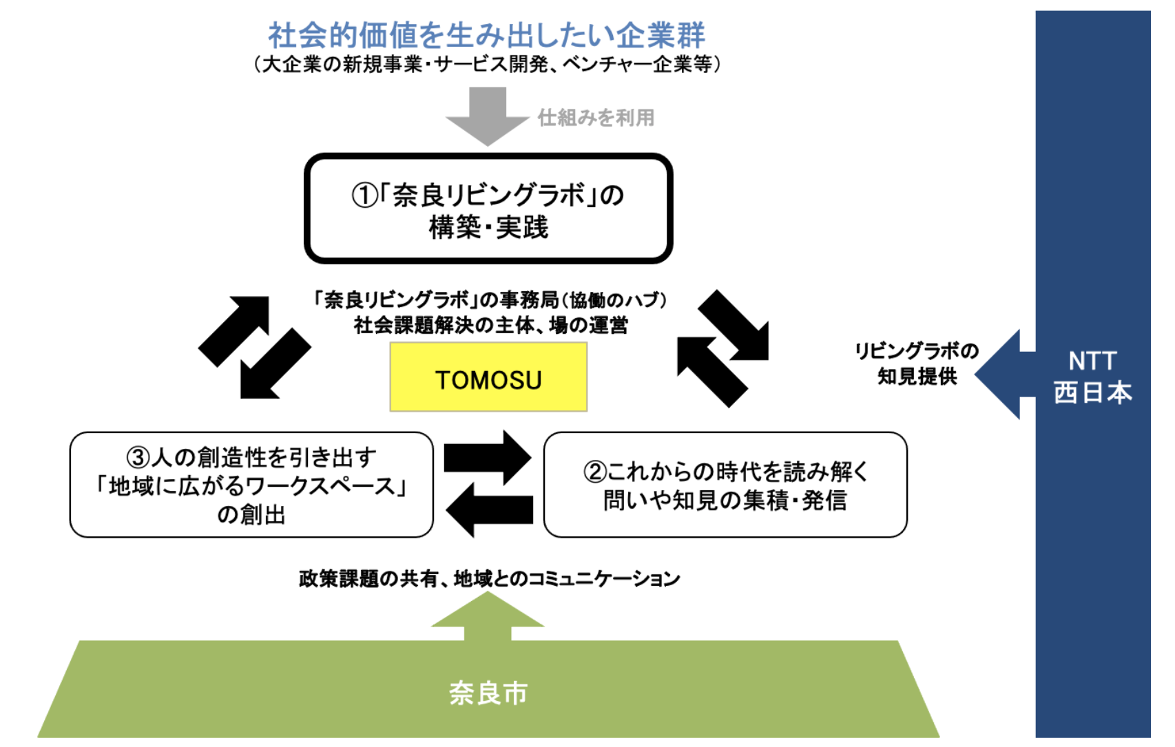 今後、奈良市、TOMOSU、NTT西日本では、「奈良リビングラボ」の仕組みを活用し、社会的価値を生み出すことに関心のある企業を積極的に地域へと呼び込み、新しいことに取り組む機運を高め、地域に暮らす人たちによる新たなチャレンジや創業を促し、「新たな価値を創出するまち」の実現をめざしていきます。