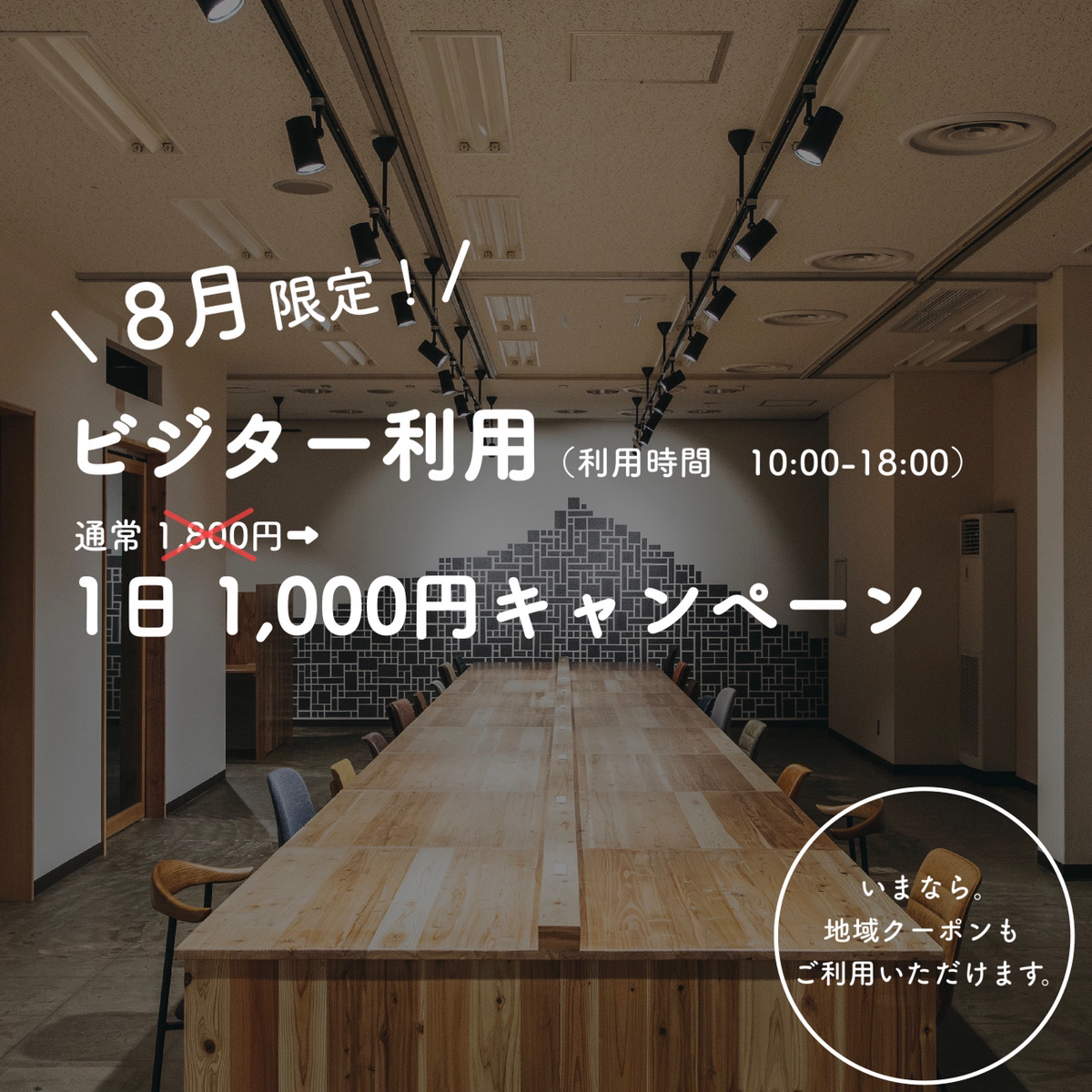 奈良に旅行で来た方、帰省で一時的に滞在する方、 コワーキングスペースへの入会を検討している方に! お得にビジター利用(1日利用)ができるキャンペーンのご案内です。 ○キャンペーン内容 ビジター利用料:通常1日1,800円 ⇨ 1日1,000円 キャンペーン期間:2022年8月1日(月)〜2022年8月31日(水) 利用可能時間:10:00〜18:00 事前予約・事前申込等は必要ありません。 1階受付でお申し込みのお手続き及びお支払いを済ませていただき、すぐにご利用いただけます。 また、ビジター利用料に「いまなら。地域限定クーポン」を利用することが可能です。 ぜひ、この機会にお試しください。