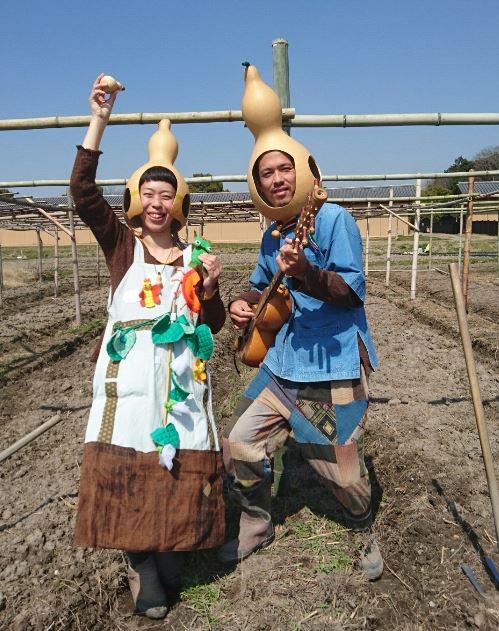 無農薬で自家栽培した瓢箪(ひょうたん)を使って自作した瓢箪楽器を演奏する夫婦のユニット。ギターも太鼓もカズーもスピーカーも被り物も瓢箪!